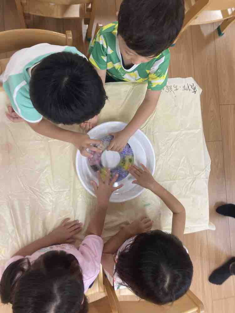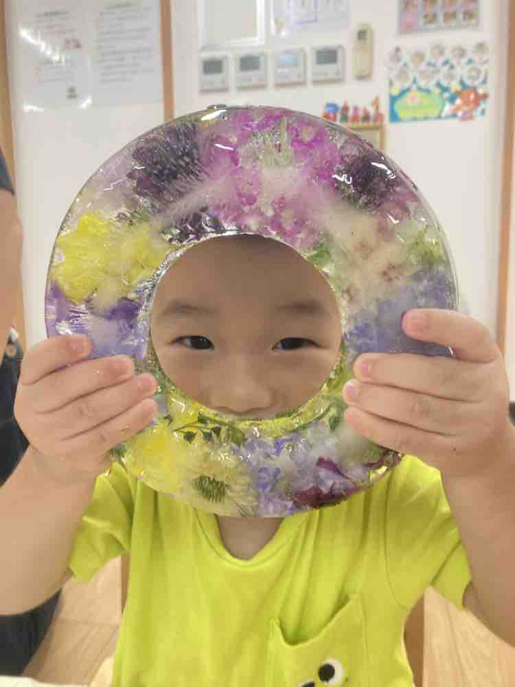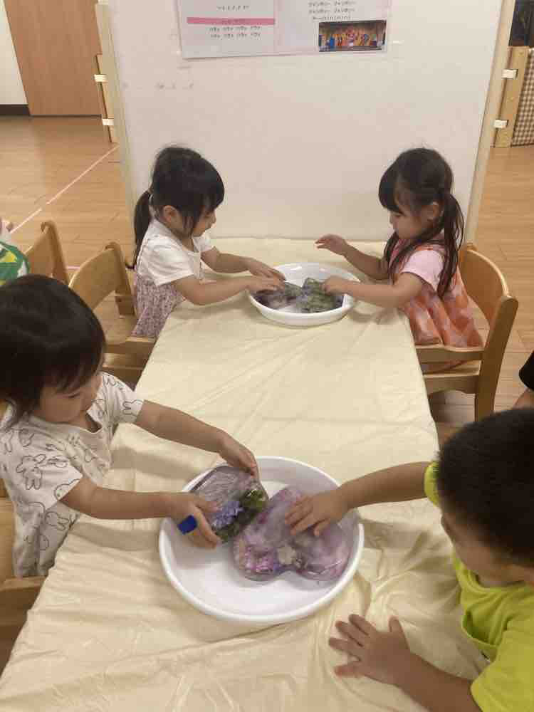「きれいだね〜」「つめたーい!!」と大喜びで,ひんやりした感触を楽しみました。