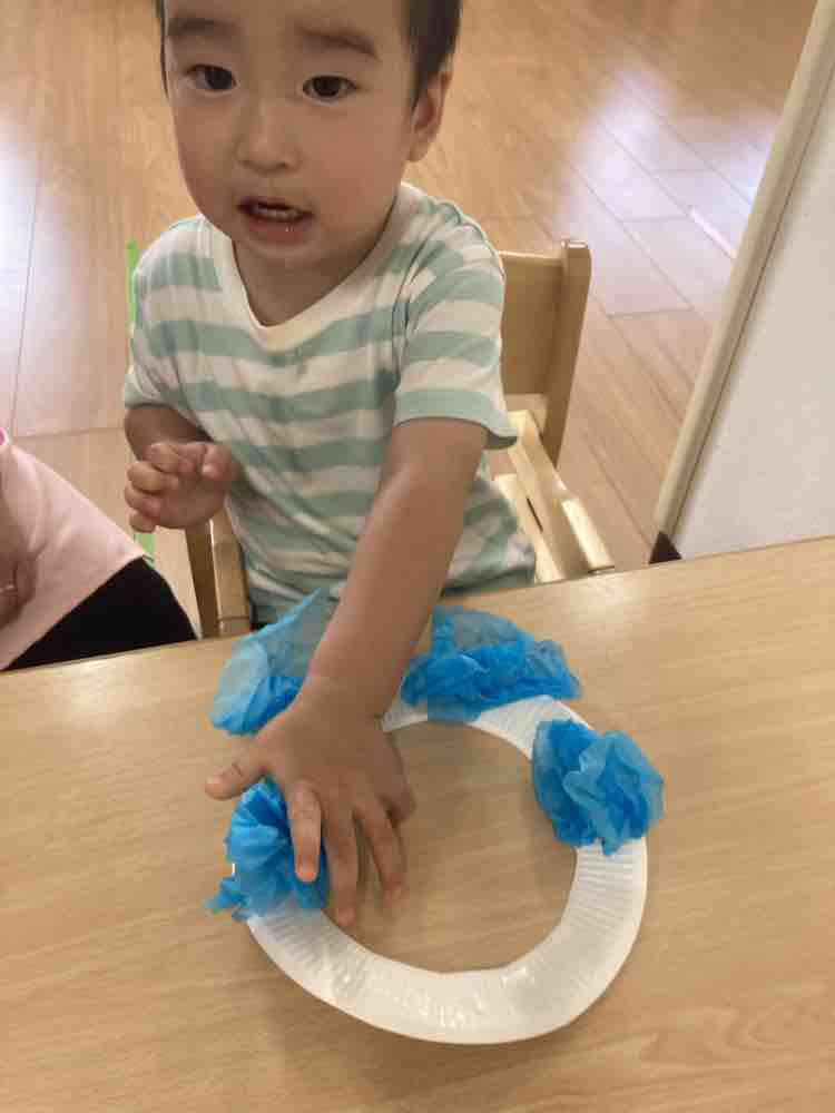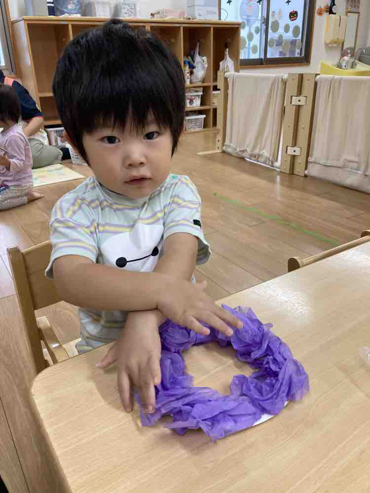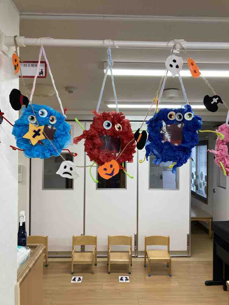 紙皿にお花紙や目をつけておばけの顔を作り、モールで装飾をしました。