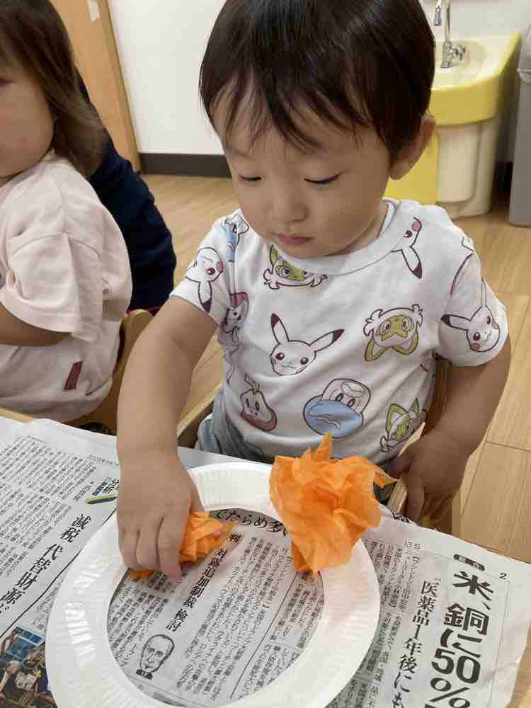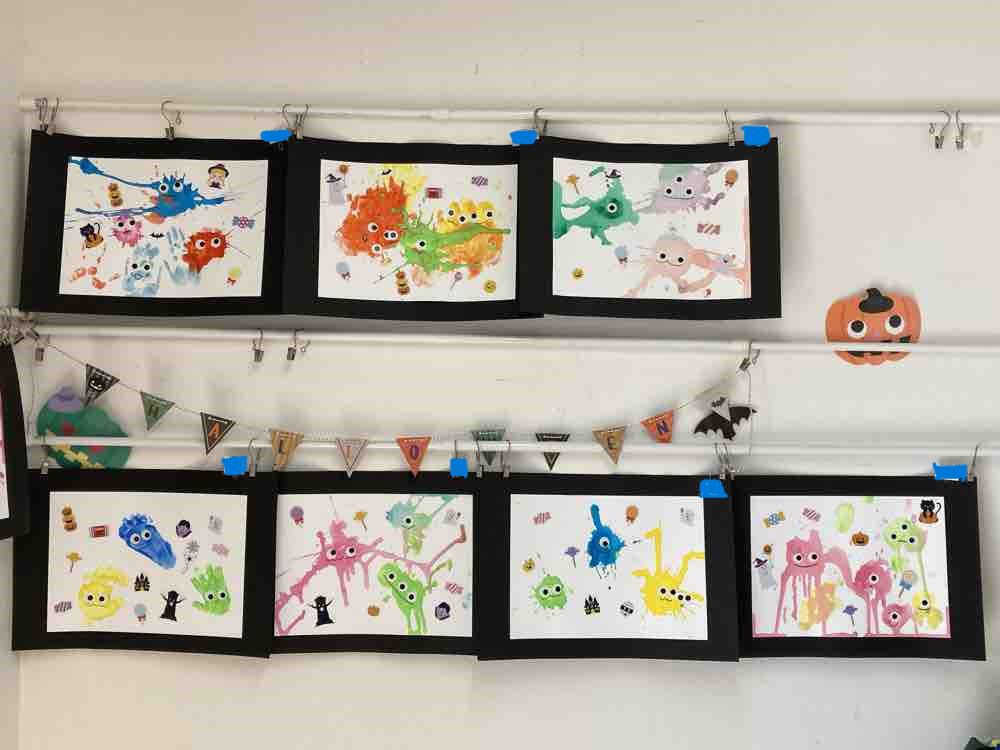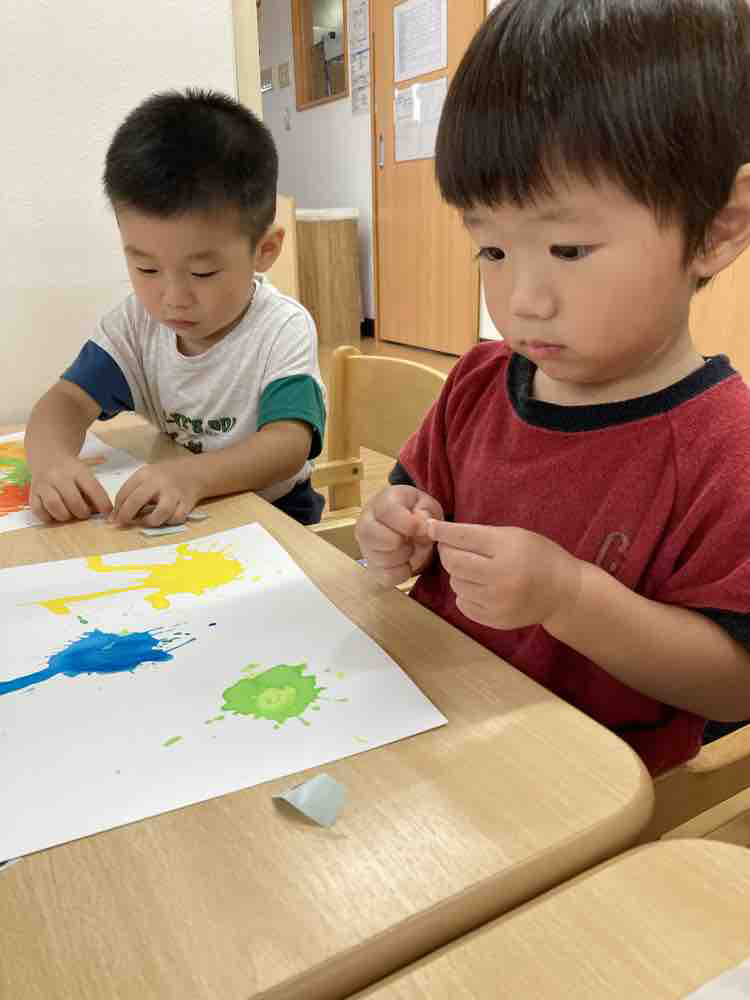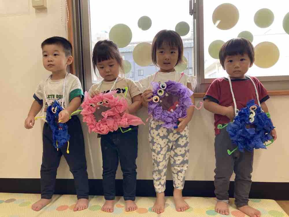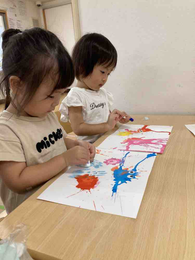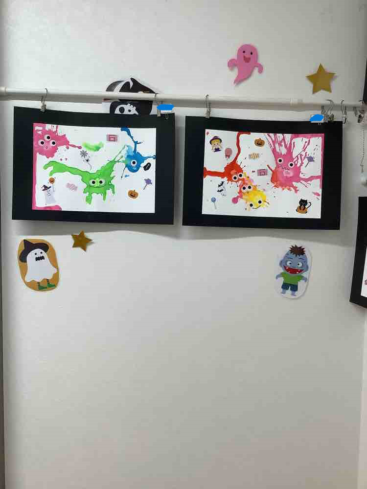 みんなそれぞれ好きな色の絵の具を選んだり、2歳児は目玉シールを自分たちの好きなところに貼って、オリジナルのおばけが完成!