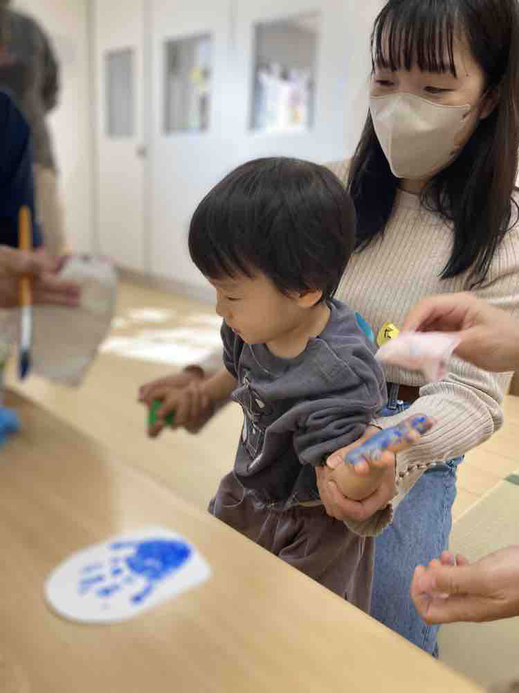 初めての方には施設案内・親子写真の撮影をさせていただき、2回目の方はお子さんの手形スタンプを一緒に取らせていただきました。手に筆で絵の具を塗られるのはくすぐったそうにしていましたが、しっかりと手を広げて塗らせてくれました。