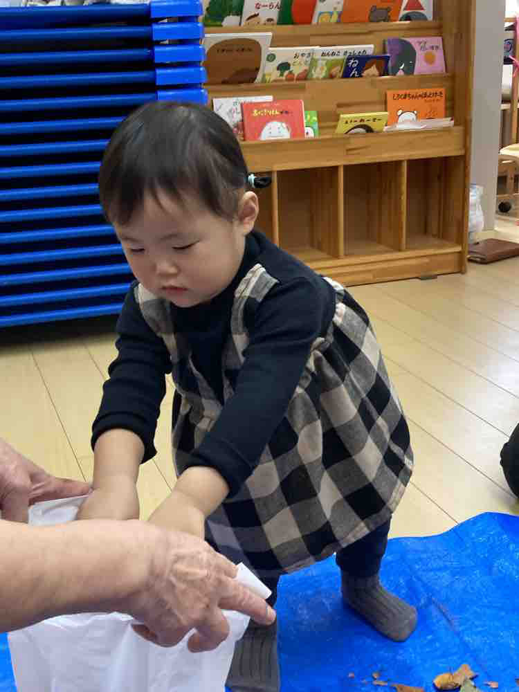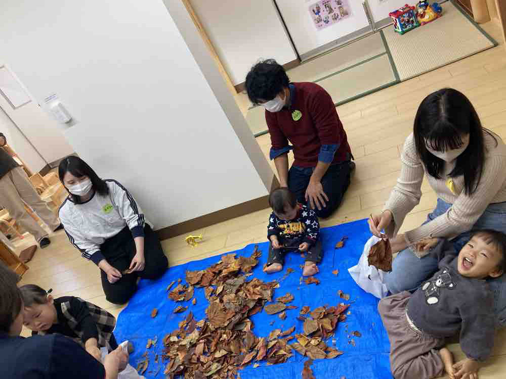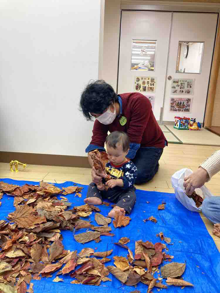 はじめは葉っぱに触れることに戸惑う姿も見られましたが、徐々に葉っぱの感触にも慣れ、お家の人や保育士とあそぶ姿が見られました。