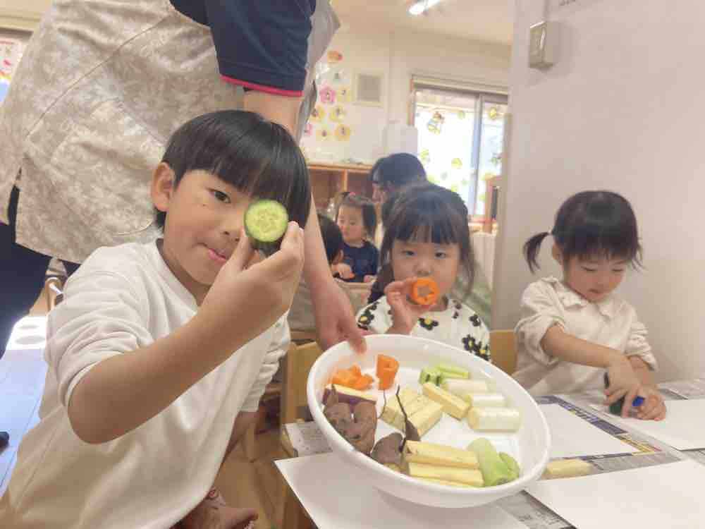 きゅうりやさつまいもにネギ、そして型抜きした人参を使ってあそびました。