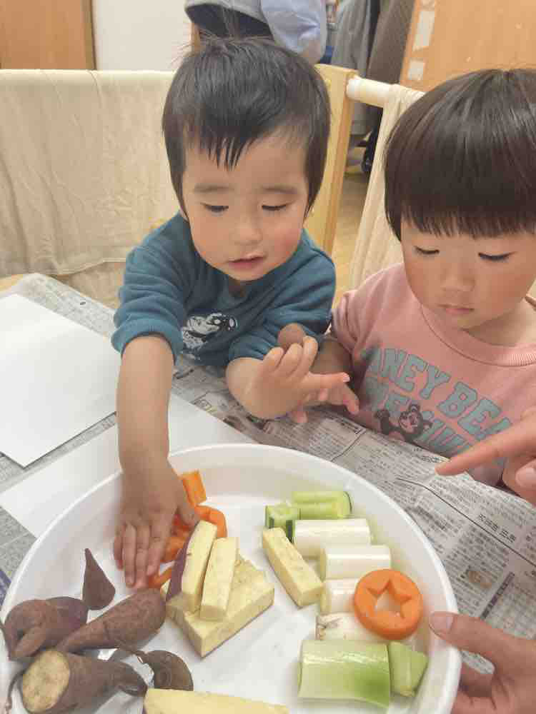 きゅうりやさつまいもにネギ、そして型抜きした人参を使ってあそびました。