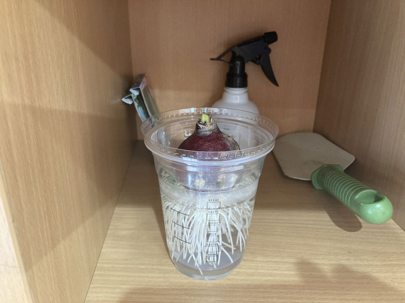 根が出て緑の芽が出るまでは、できるだけ暗くて涼しいところに置きます。