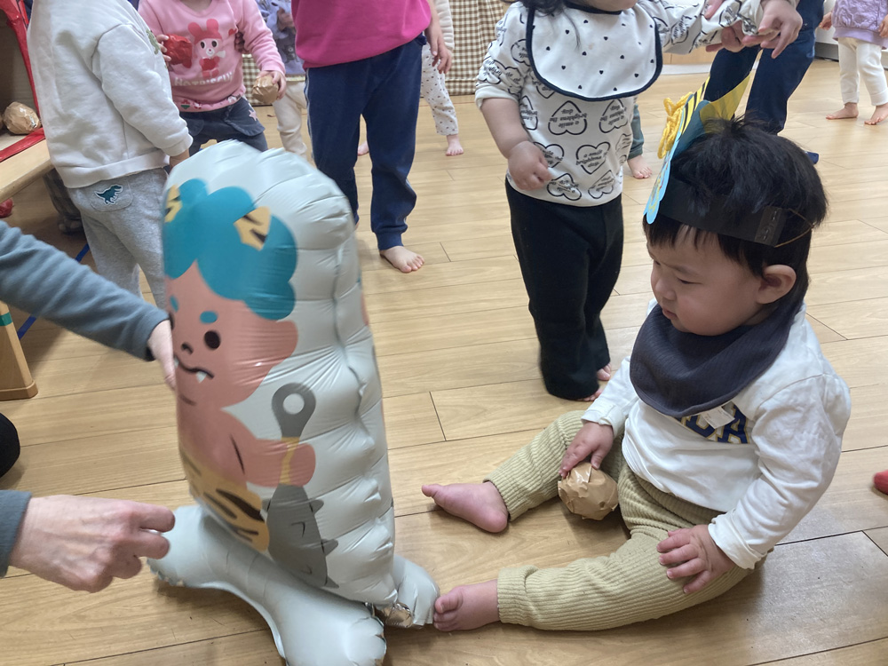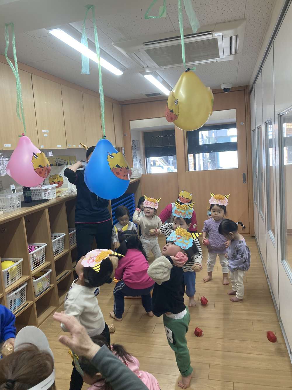 風船鬼やダンボール鬼に向かって、「鬼は外!福はうち!」