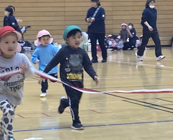 3~5歳児は30m走です。ゴールテープを目指して一生懸命走りました。