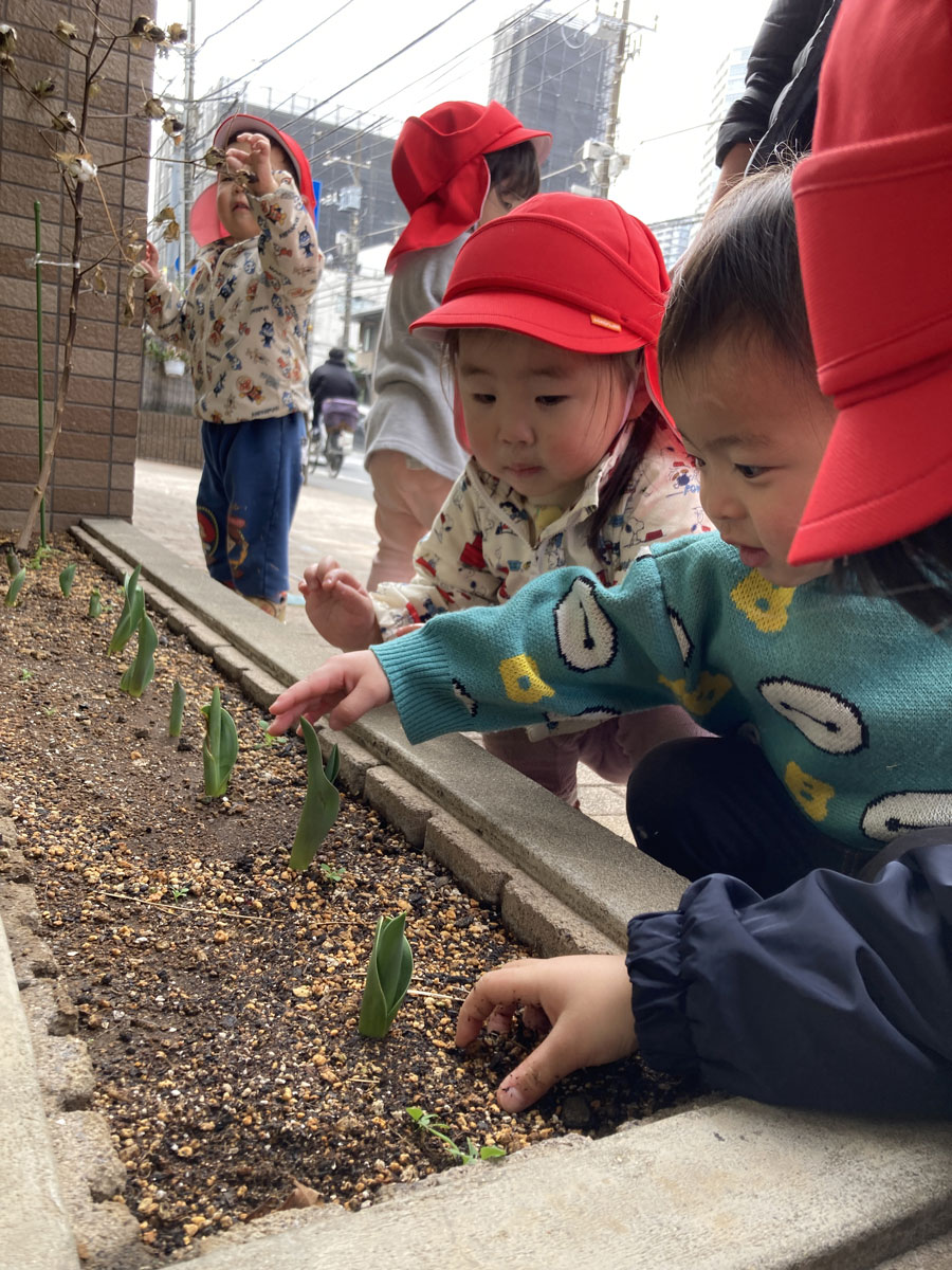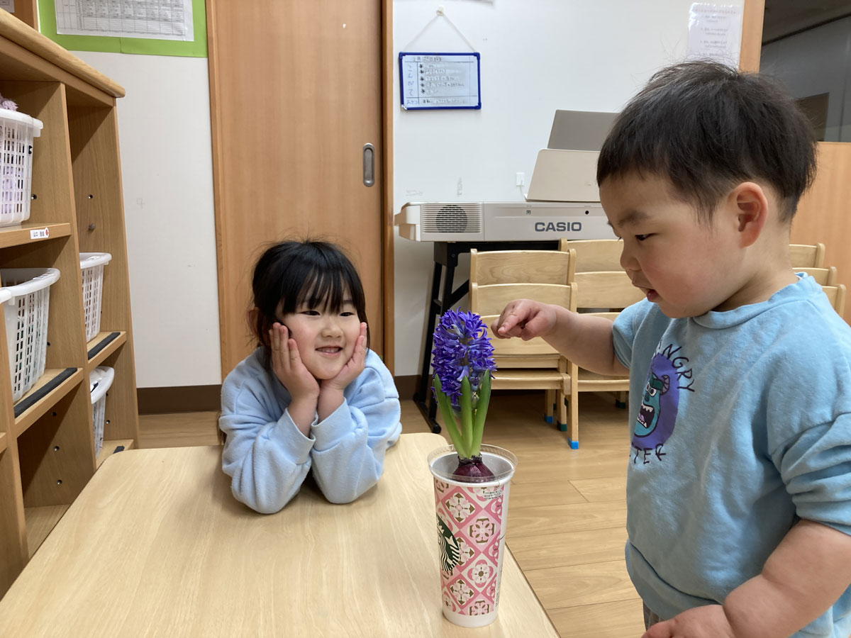 「先生、紫のヒヤシンス咲いてるよ!」と子どもたちが教えてくれました。