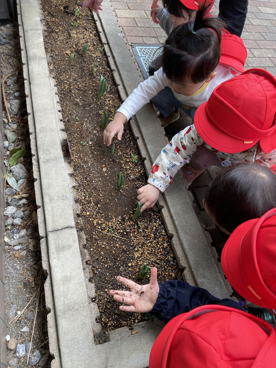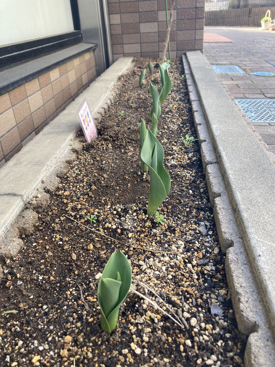 花壇のチューリップも少しずつ成長しています。