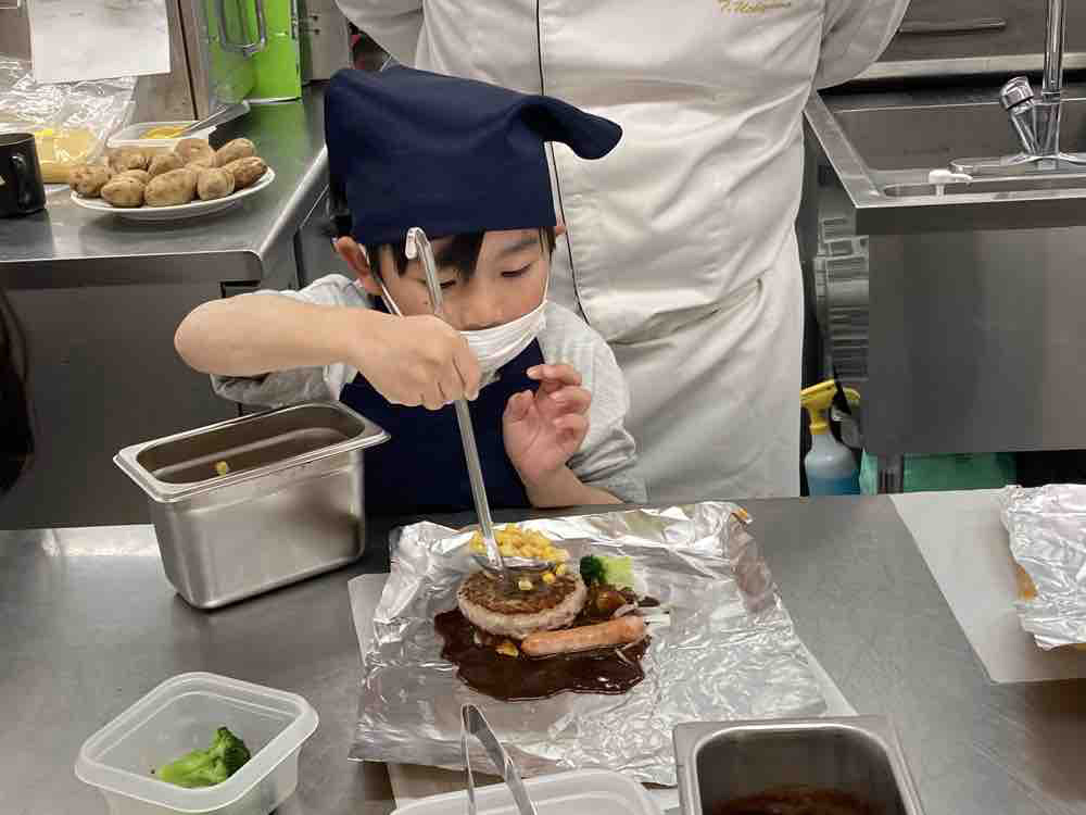 切るところは保護者と一緒に慎重に。盛り付けは、真剣な表情で考えながら行いました。みんなとても上手にできて、できあがったハンバーグに歓声が上がっていました。