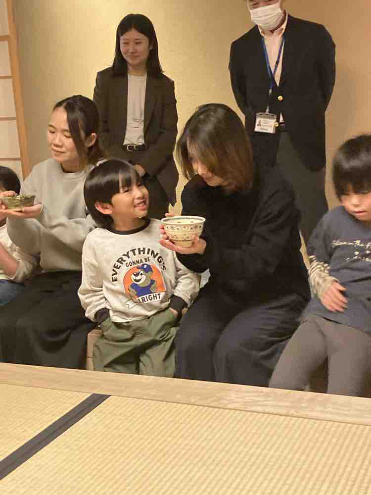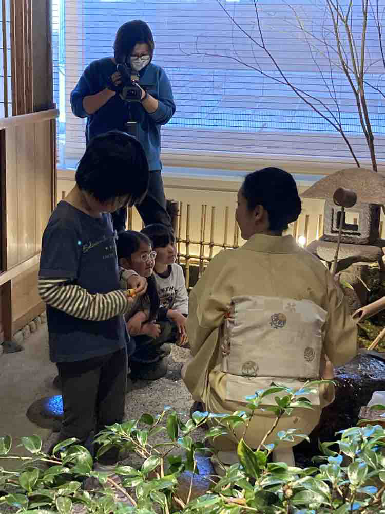 ハンバーグとプリンアラモードでおなかがいっぱいになった後は、茶室に移動して保護者にお茶を点てました。茶室はテストキッチンの隣にあり、和の雰囲気に興味津々の子どもたち。