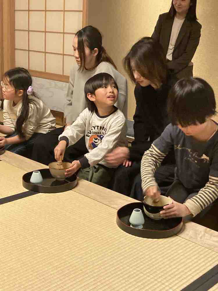 蹲(つくばい)で手と口を清めてから茶室へ入り、一人ずつ茶器を手に取りお茶を点てました。とっても嬉しそうな表情がたくさん見られた一日でした。