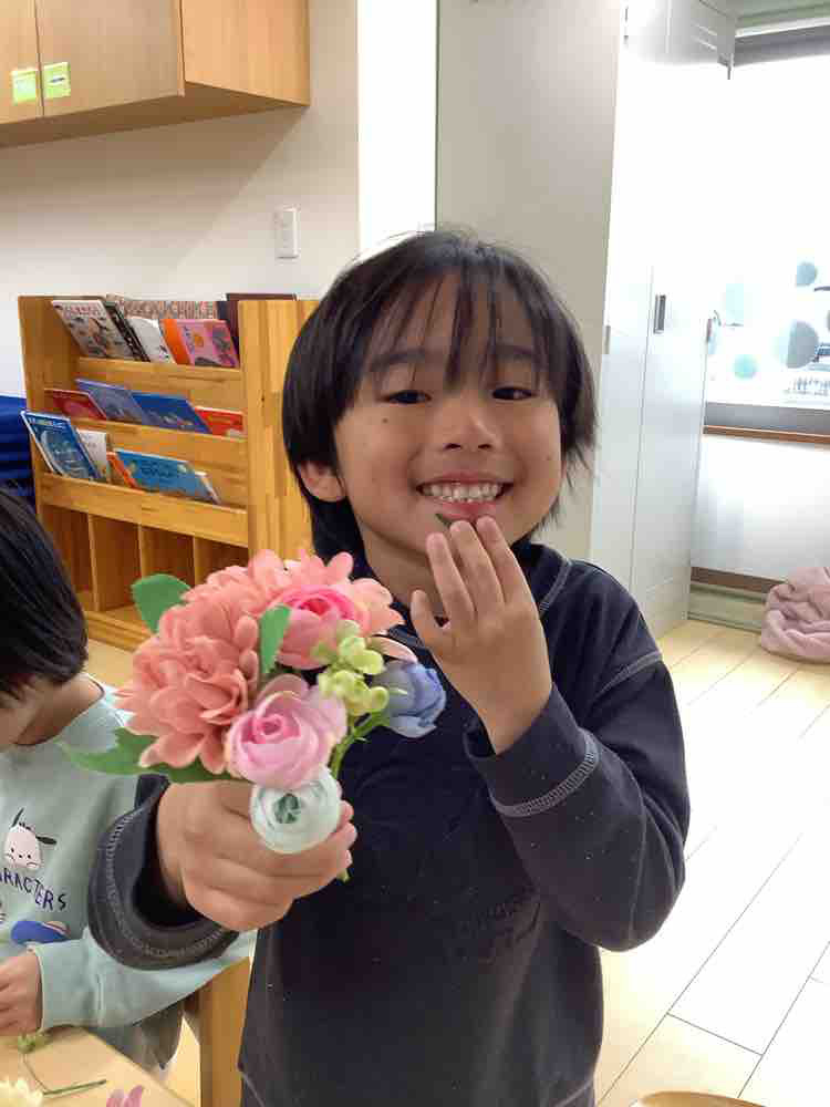 「僕は青が好き!」「お母さんの分はピンク♪」「どのお花にしようかな~」と、試行錯誤して、とっても素敵なコサージュができました。