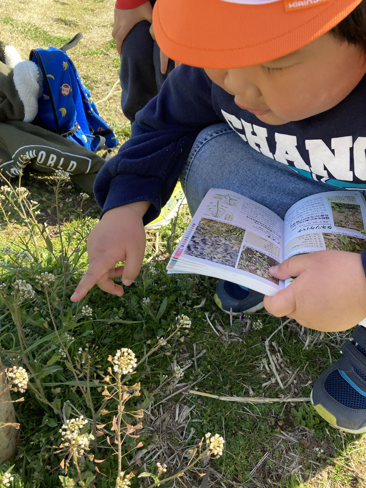 お散歩には図鑑を持っていき、見つけたお花を見ながら