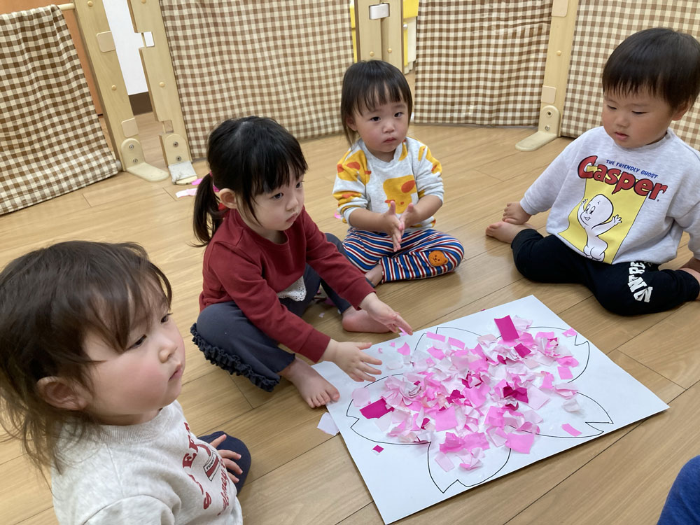 おりがみをちぎって、ちぎり絵で桜の花びらを作りました。