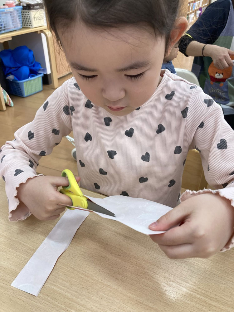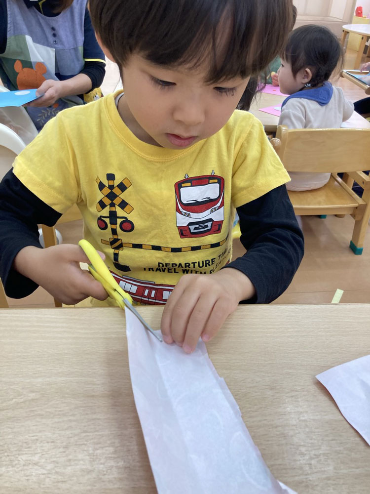 3歳以上の園児はハサミを使って折り紙を好きな形に切り、思い思いの模様を貼って仕上げました。