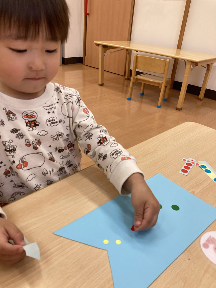 そのほかの園児は、カラフルなシールの中からお気に入りを選び、ペタペタと貼ることを楽しんでいました。