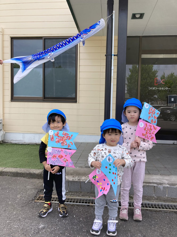 完成したこいのぼりは、玄関の大きなこいのぼりと一緒に記念撮影をしました。